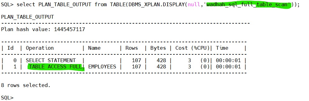 SQL> EXPLAIN PLAN SET statement_id = 'wadhah_sql_full_table_scan' FOR select salary from employees;